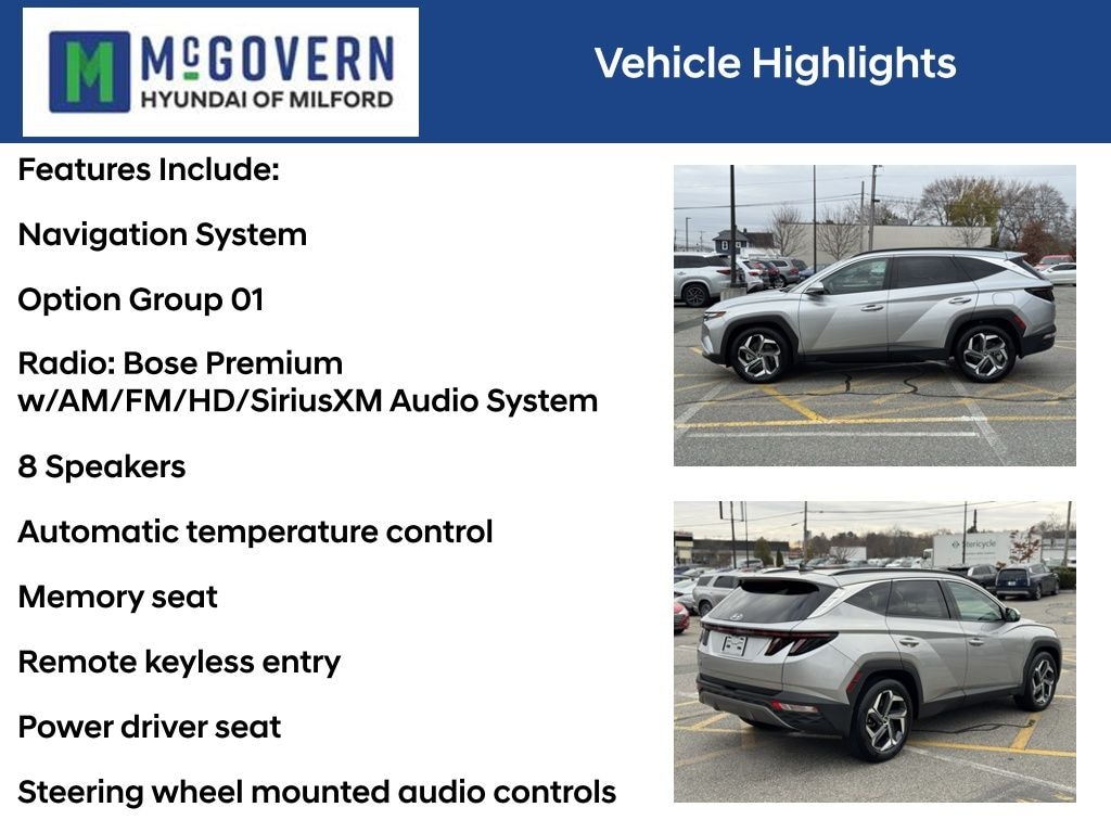 Recent Arrival! McGovern Hyundai Of Milford is proud to present this... Shimmering Silver 2023 Hyundai Tucson Limited 2.5L I4 DGI DOHC 16V LEV3-ULEV70 187hp 8-Speed Automatic with SHIFTRONIC FWD CARFAX One-Owner. Clean CARFAX.