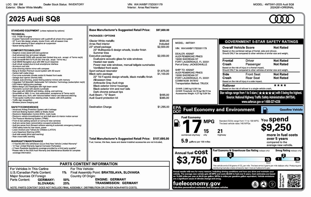 Boston Motorsports is proud to present this 2025 Audi SQ8 4.0T Premium Plus quattro 4.0L V8 Turbocharged DOHC 32V Engine 8-Speed Automatic Transmission quattro optioned in Glacier White over Arras Red. This SQ8 Boasts a clean 1-owner Carfax displaying a healthy service history. Fully serviced and professionally detailed, now available in our Boston showroom!
