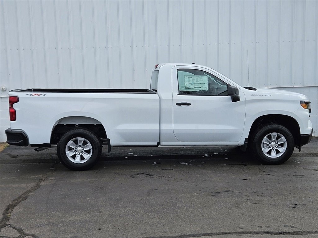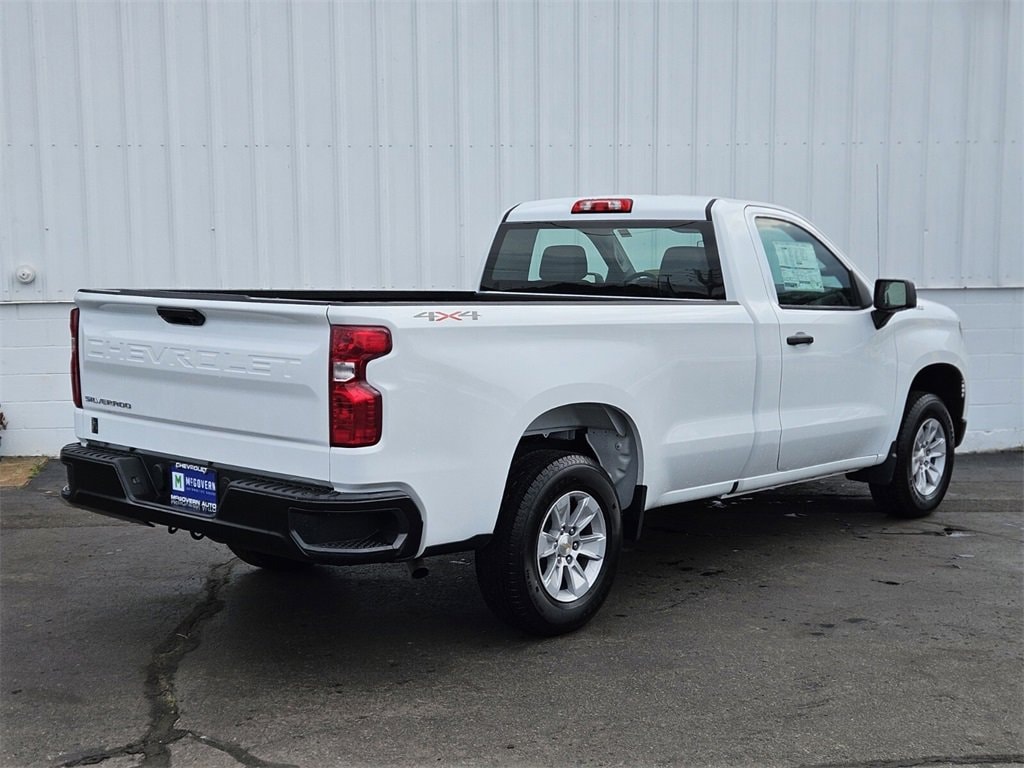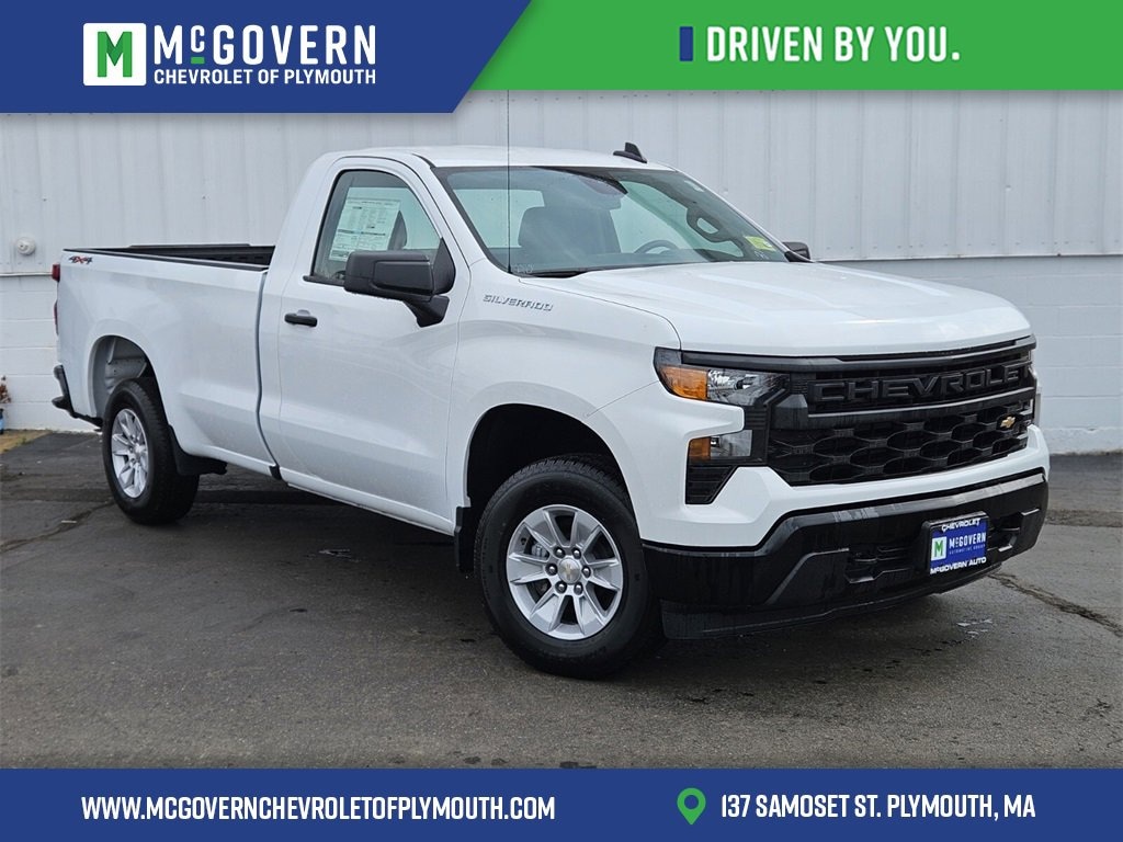 McGovern Chevrolet/Cadillac of Plymouth is proud to present this 2025 Chevrolet Silverado 1500 with Preferred Equipment Group 1WT (3.5 Monochromatic Display Driver Info Center, 4-Way Manual Driver Seat Adjuster, Black (Semi-Gloss) Front Bumper, Black (Semi-Gloss) Rear Bumper, Bluetooth® For Phone, Electronic Cruise Control, Front Frame-Mounted Black Recovery Hooks, HD Rear Vision Camera, Heated Power-Adjustable Outside Mirrors, Inside Rear-View Mirror w/Tilt, Locking Tailgate, Manual Tailgate Function w/No EZ Lift, Manual Tilt Wheel Steering Column, OnStar Services Capable, Power Front Windows w/Driver Express Up/Down, Power Front Windows w/Passenger Express Down, Remote Keyless Entry, Rubberized-Vinyl Floor Covering, SiriusXM Delete, Solar Absorbing Tinted Glass, Standard Tailgate, Teen Driver, Tire Pressure Monitoring System, and Wi-Fi Hot Spot Capable), Standard Suspension Package, 10-Speed Automatic, 4WD, Jet Black Vinyl, 170 Amp Alternator, 2 Speakers, 2-Speaker Audio System, 220 Amp Alternator, 4-Wheel Disc Brakes, 40/20/40 Front Split Bench Seat, ABS brakes, Air Conditioning, Apple CarPlay/Android Auto, Auto High-beam Headlights, Auto-Locking Rear Differential, Automatic Emergency Braking, Auxiliary External Transmission Oil Cooler, Brake assist, Chevrolet Infotainment 3 Stereo System w/6 Speakers, Chevrolet Infotainment 3 System, Chevytec Spray-On Black Bedliner, Compass, Delay-off headlights, Driver door bin, Dual front impact airbags, Dual front side impact airbags, Electronic Stability Control, Emergency communication system: OnStar, External Engine Oil Cooler, Following Distance Indicator, Forward Collision Alert, Front anti-roll bar, Front Center Armrest w/Storage, Front License Plate Kit, Front Pedestrian Braking, Front reading lights, Front wheel independent suspension, Fully automatic headlights, Heated door mirrors, Illuminated entry, IntelliBeam Automatic High Beam On/Off, Lane Keep Assist w/Lane Departure Warning, Low tire pressure warning, Occupant sensing airbag, Outside temperature display, Overhead airbag, Overhead console, Panic alarm, Passenger door bin, Passenger vanity mirror, Power door mirrors, Power steering, Power windows, Radio data system, Rear reading lights, Rear step bumper, Remote keyless entry, Speed control, Speed-sensing steering, Tachometer, Tilt steering wheel, Traction control, Trip computer, Variably intermittent wipers, Vinyl Seat Trim, Voltmeter, Wheels: 17 x 8 Bright Silver Painted Aluminum, and Wheels: 17 x 8 Ultra Silver Painted Steel. Features and Options include:, 10-Speed Automatic, 4WD, Jet Black Vinyl.