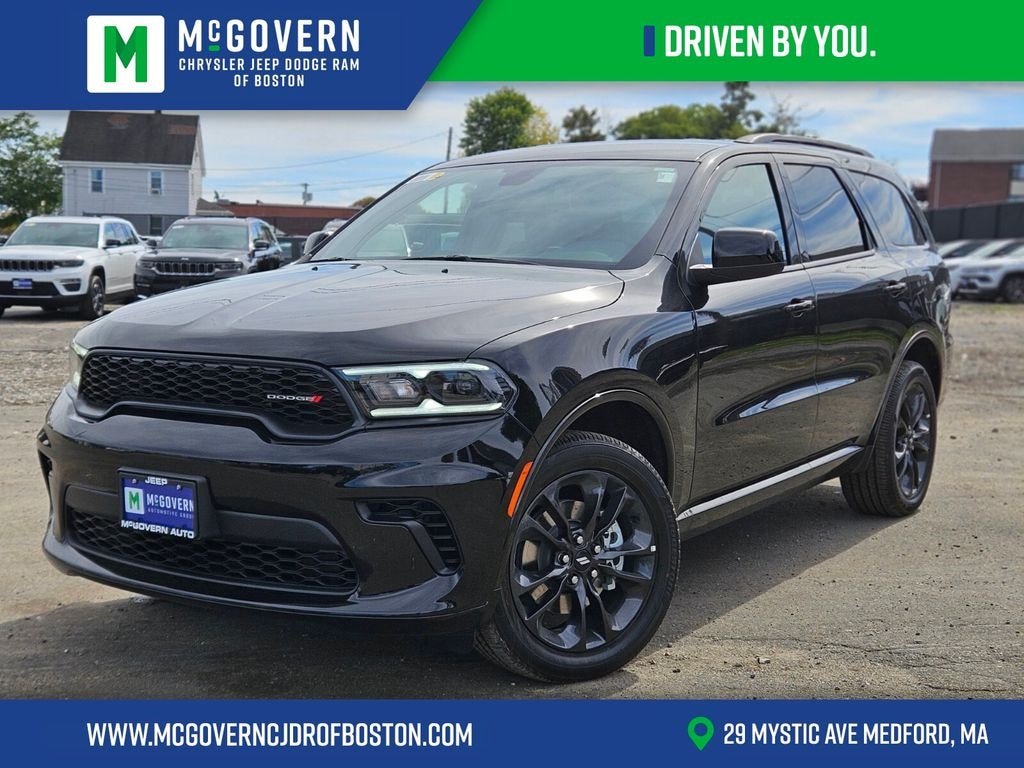 DB Black Crystal Clearcoat 2026 Dodge Durango GT AWD 8-Speed Automatic 3.6L V6 24V VVT Features and Options include:, AWD, 3rd row seats: split-bench, 4-Wheel Disc Brakes, 6 Speakers, AM/FM radio: SiriusXM w/360L, Apple CarPlay/Android Auto, Auto-dimming Rear-View mirror, Black Roof Rails, Blacktop Package, Front anti-roll bar, Front Bucket Seats, Garage door transmitter, Gloss Black Badges, Gloss Black Exterior Mirrors, GT Gloss Black Badging, Heated front seats, Heated steering wheel, Illuminated entry, Integrated Roof Rail Crossbars, Knee airbag, Navigation System, ParkView Rear Back-Up Camera, Power driver seat, Quick Order Package 2BD GT, Radio: Uconnect 5 Nav w/10.1" Display, Rear reading lights, Satin Black Dodge Tail Lamp Badge, Telescoping steering wheel, Tilt steering wheel, Wheels: 20" x 8" Black Noise Aluminum.