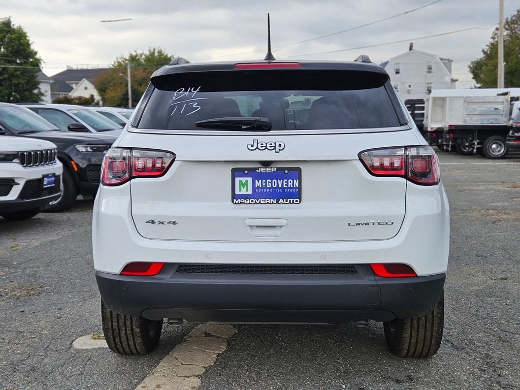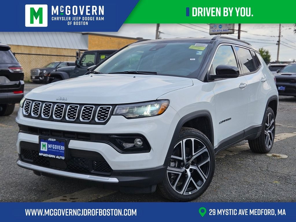 Bright White Clearcoat 2025 Jeep Compass Limited 4WD 8-Speed Automatic 2.0L I4 DOHC Features and Options include:, 4WD, 10.1" Touchscreen Display, 4-Wheel Disc Brakes, Air Conditioning, Apple CarPlay/Android Auto, Auto High-beam Headlights, Brake assist, Delay-off headlights, Driver vanity mirror, Dual front impact airbags, Emergency communication system: Jeep Connect, Front fog lights, Fully automatic headlights, Heated door mirrors, Illuminated entry, Leather Shift Knob, Leather steering wheel, Overhead console, ParkView Rear Back-Up Camera, Power door mirrors, Power steering, Power windows, Quick Order Package 29G, Radio: Uconnect 5 w/10.1" Display, Spoiler.