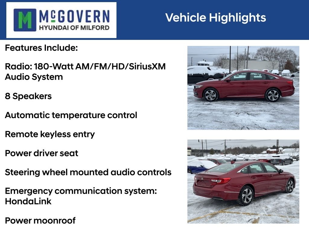 Recent Arrival! McGovern Hyundai Of Milford is proud to present this... Red 2018 Honda Accord EX 1.5T I4 DOHC 16V Turbocharged VTEC CVT FWD CARFAX One-Owner.